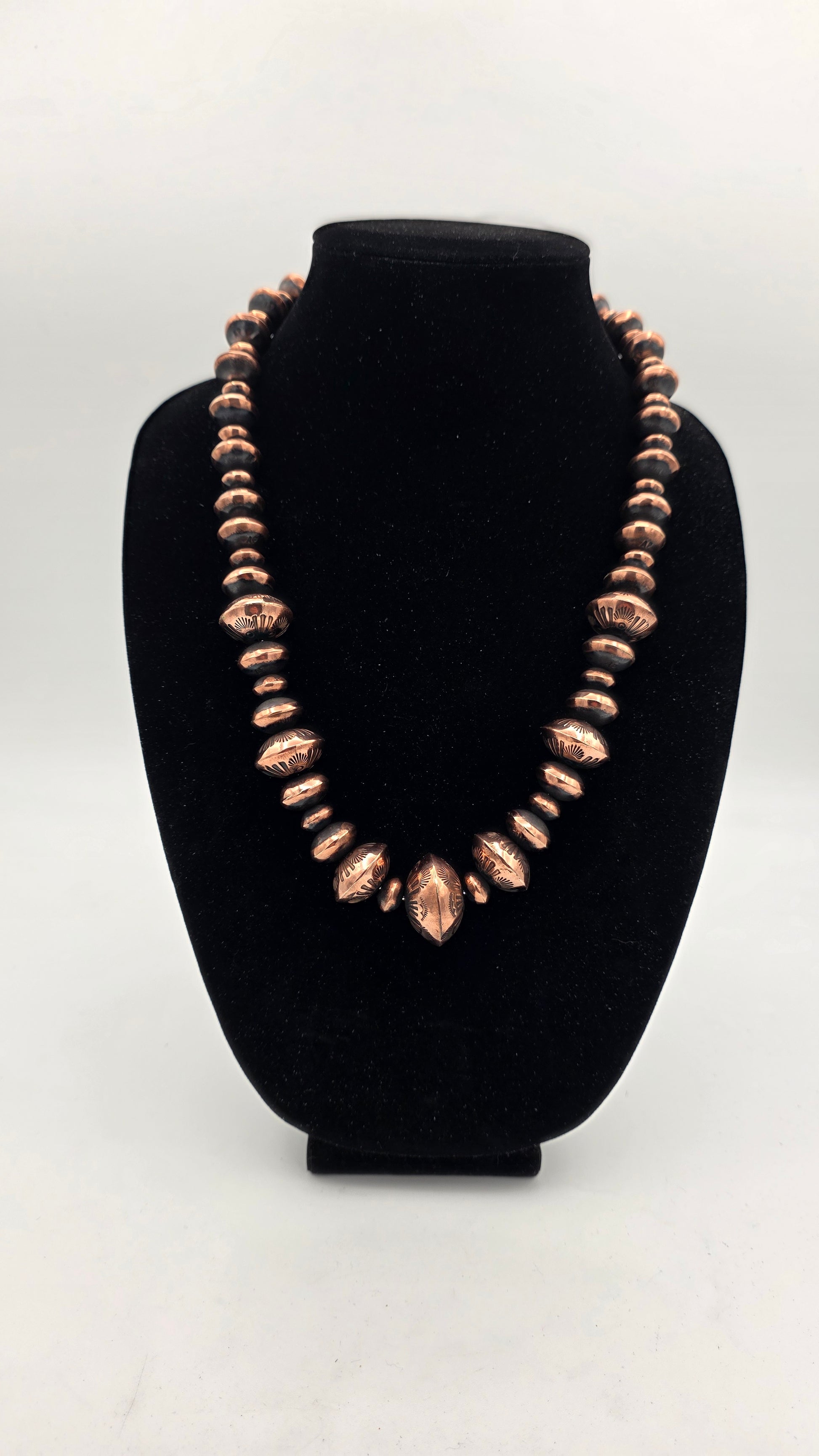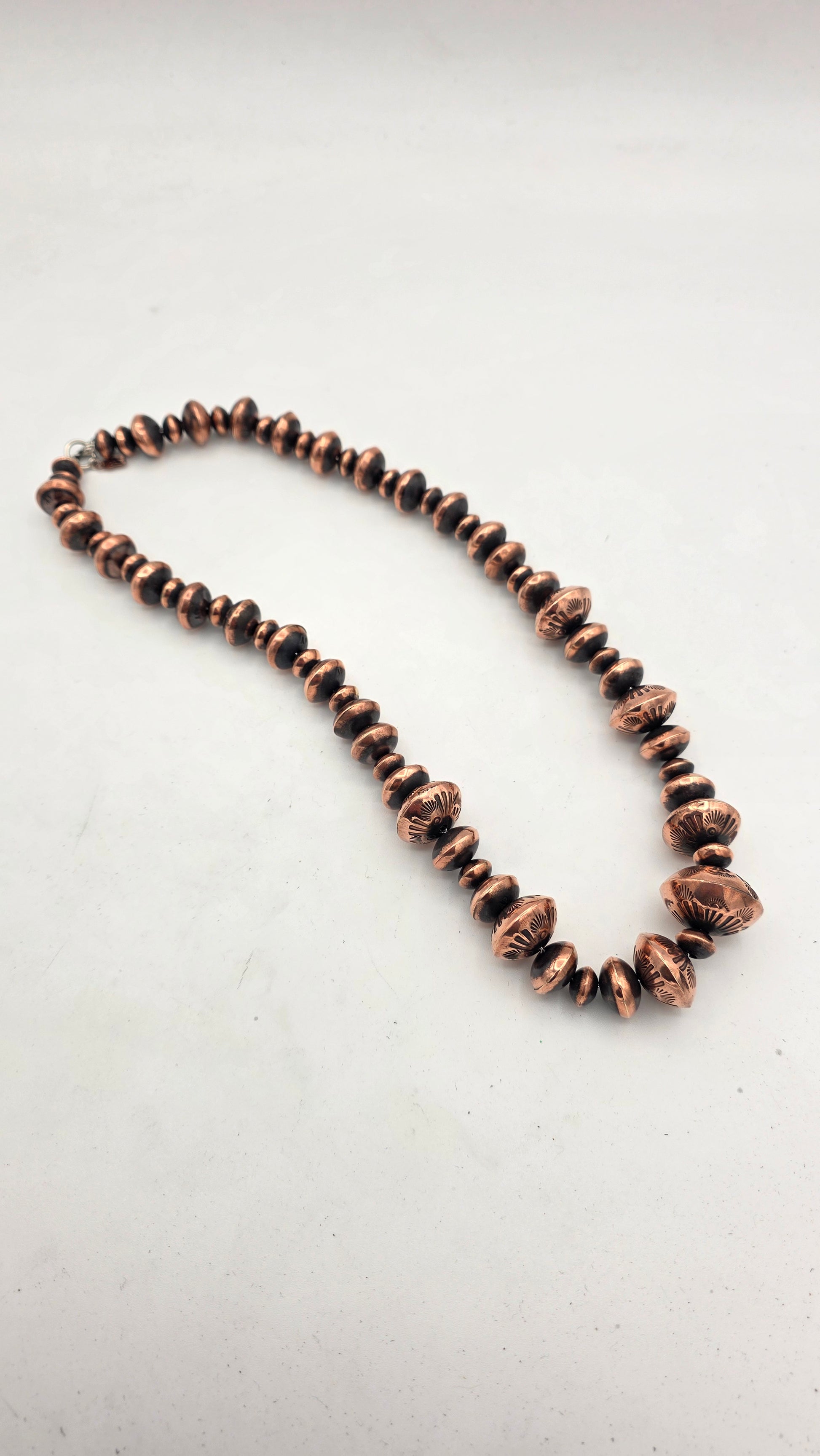I hear you guys... And here's your chance. 2 ft of copper Arizona Pearl®.This is that copper statement piece you've been always wanting. This thing is big and loud. Patinaed in that Navajo pearl style that you all love so much at a price that wont break the bank. All beads are handmade and larger beads are stamped with a intricate design and also a handmade toggle for easy on and off. Rolo chain and toggle hardware is all sterling silver. Necklace messure at slightly over 24".