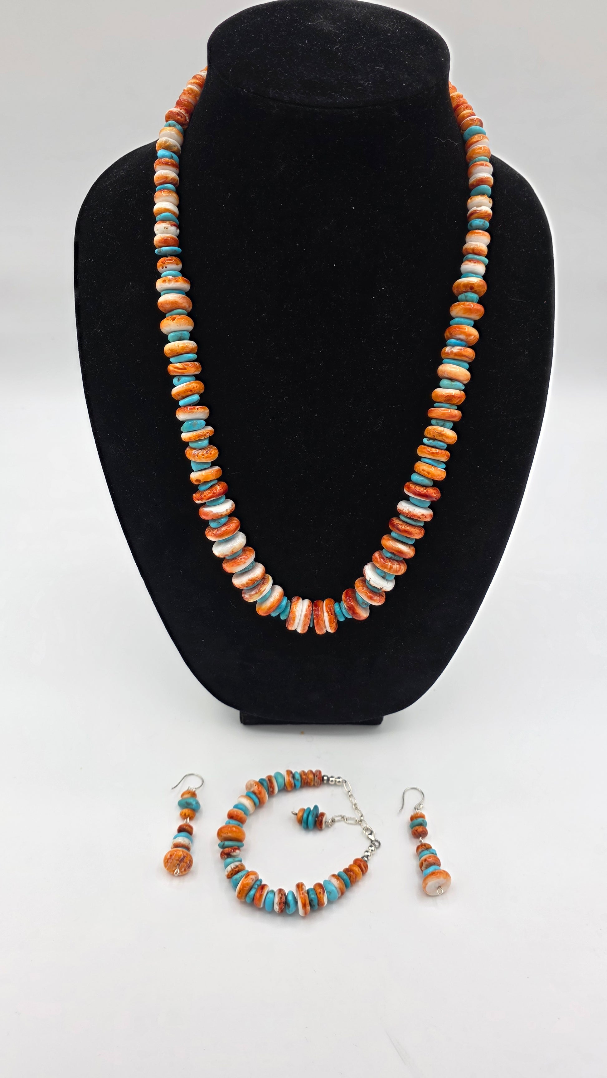 I can tell you right now if your looking at the set....you definitely need it. This is a combination of orange spiney oyster and "SLEEPING BEAUTY" this 24" Necklace...1. Feels good.... 2.Looks good...3.and will make you feel good this summer at any rodeo or bqq with some friends. This set doesn't only have a necklace it also comes with a beautiful matching bracelet to take out any confusion of what to match it with.( Summers a time to be outside not trying to figure out whats going with what ). And finally to boot a matching set of dangling earrings.....comes free with extra dangle 😉. So if your looking for the set this year....here it is